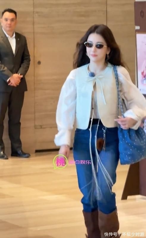 她选择了一件廓形松垮的纯白短款外套,袖管异常宽大,削弱了肩颈线条的利落感;下装是一条基础款直筒牛仔裤,脚踩一双棕褐色过膝长靴,整体缺乏层次过渡与视觉焦点。